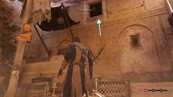 走到尽头向右看可以看到标记,从标记上方的窗户进入