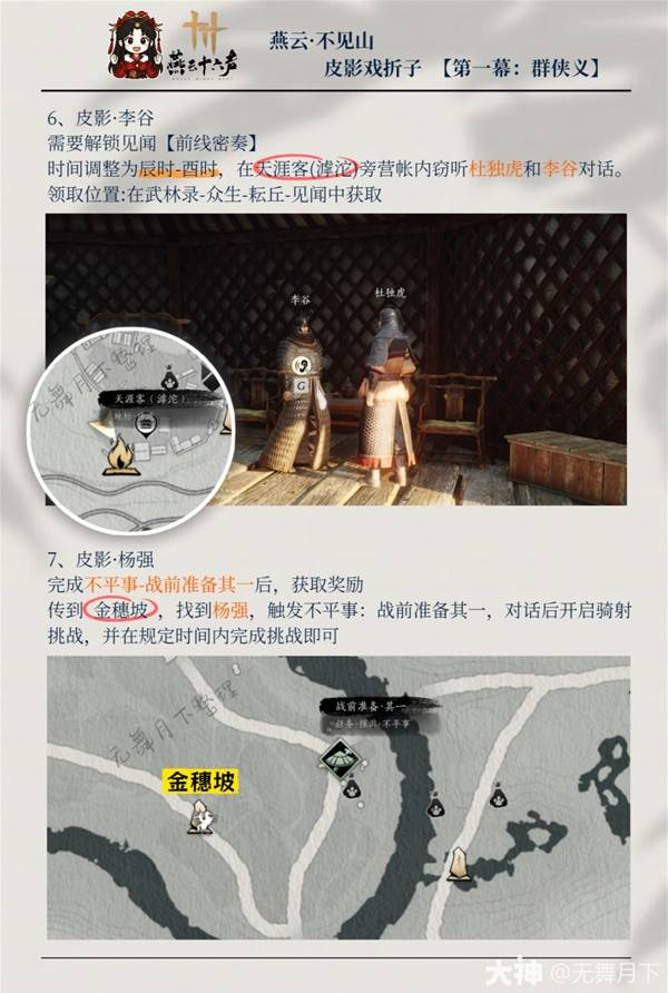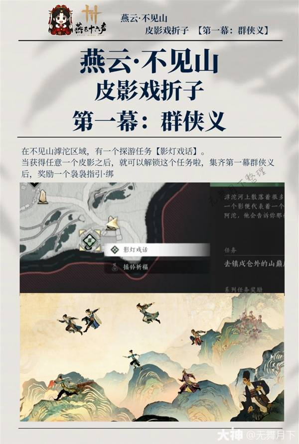 《燕云十六声》影灯戏话第一幕群侠义中共有7个皮影戏折子可以收集,下面请看由“无舞月下”为大家带来的《燕云十六声》影灯戏话群侠义皮影戏折子收集,希望可以帮助到大家。