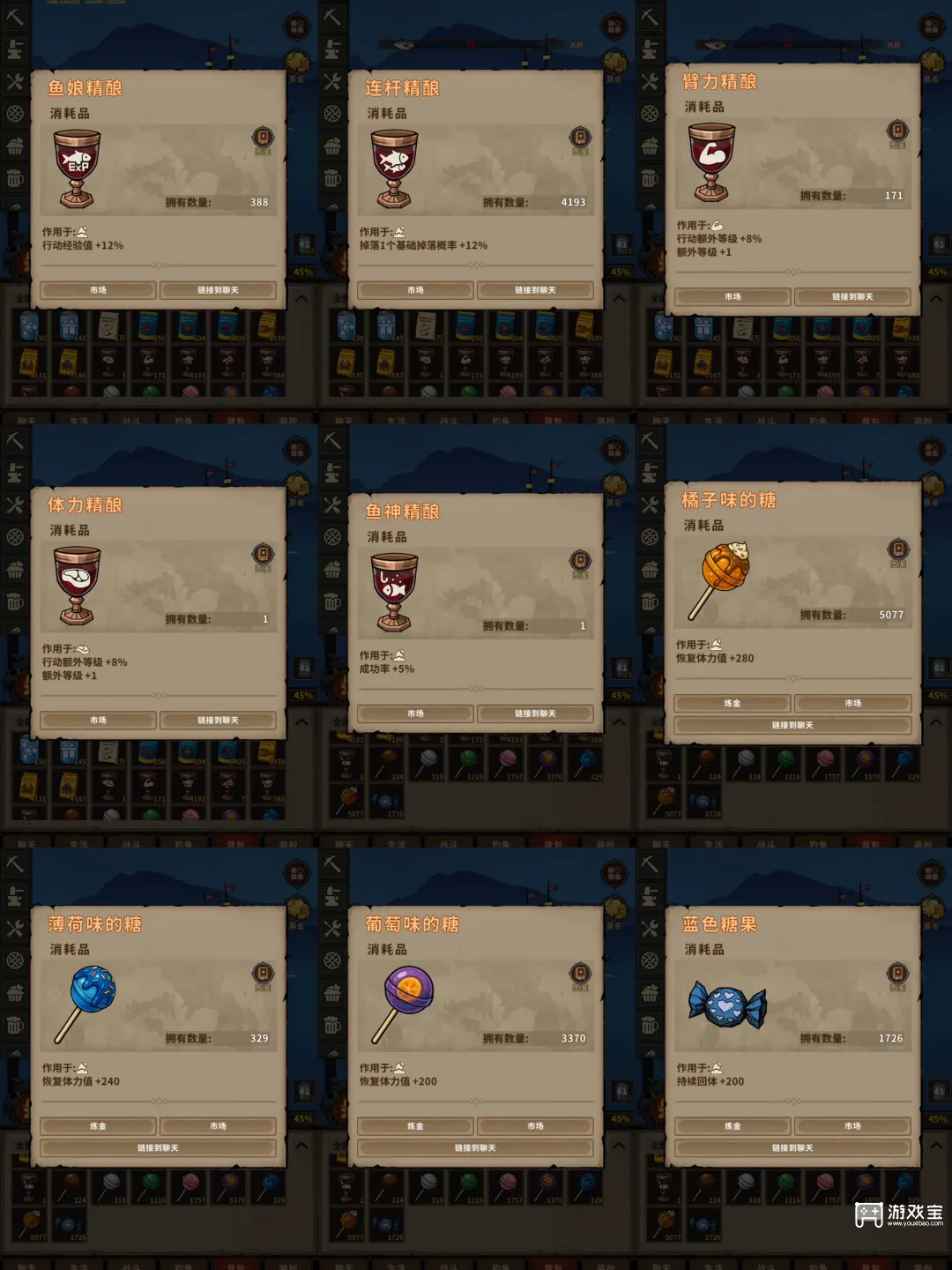 5.钓鱼【消耗大】饵料+棒棒糖+糖果+药剂