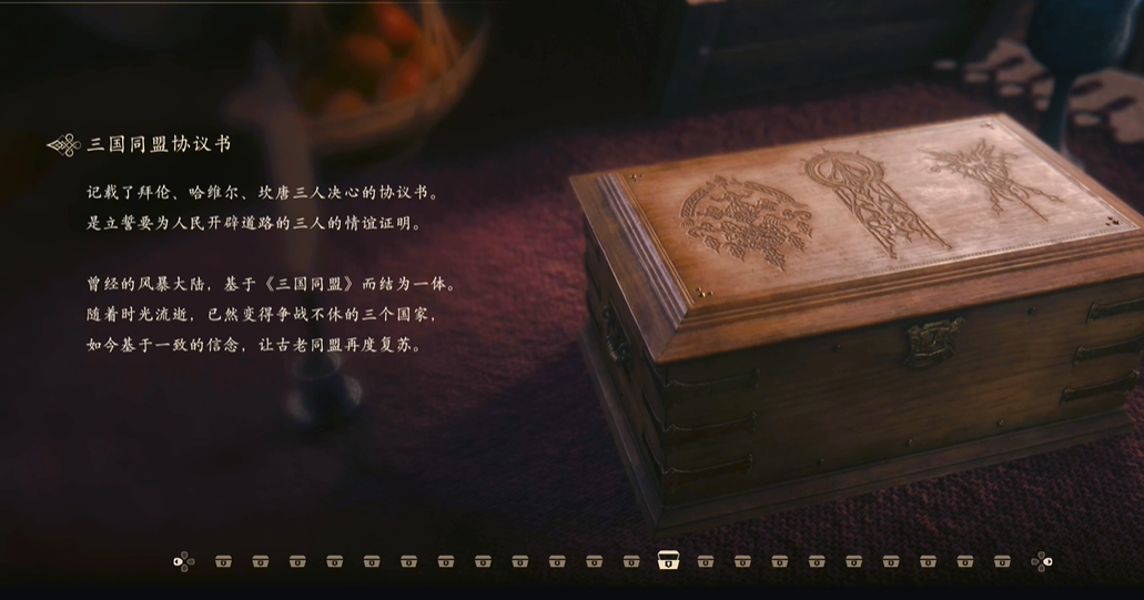 最终幻想16全回忆物品收集攻略。当玩家们剧情进展到更换藏身处的节点时就能够开始收集回忆物品,大部分是完成支线任务获得的。在收集所有物品之后在架子上调查所收集的物品即可解锁奖杯“旅程的回忆”。下面带来回忆物品三国同盟协议书的获取方法,供各位玩家们参考。