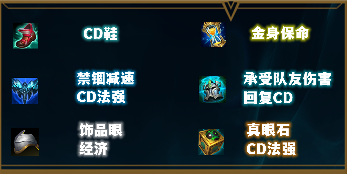 除了永霜外,锤石的装备和平时差别不大,也是主要以叠CD为主,然后后期就可以打出多次Q技能控场。鞋子选择CD鞋,辅助装备选择加攻击的,因为前期对线对拼比较有用。做完永霜后可以直接转金身,现在伤害都很高,出完永霜的时间点一般其他C位都已经3件套,只有金身才能够有效保命。然后可以做一件骑士来给C位吃伤害,最后补出真眼眼石,这个石头13级后可以增加不少的法强和CD。