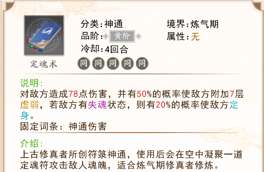 定魂术:对敌方造成伤害,有概率附加虚弱,若敌方有失魂状态,则有概率附加定身效果。
