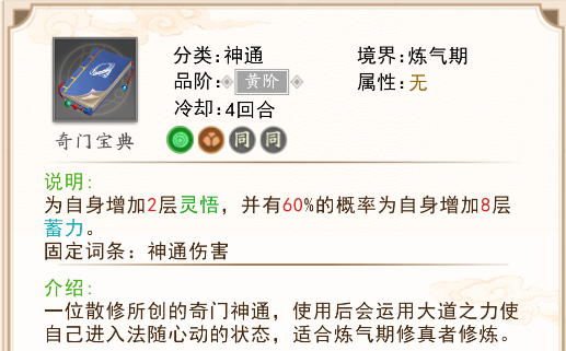 奇门宝典:增加灵悟层数,有概率增加蓄力层数。