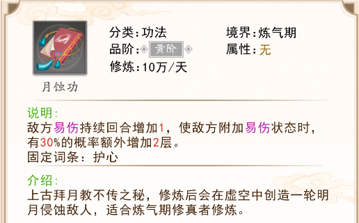 月蚀功:为对方增加易伤状态,每层易伤会使对方受伤时,额外受到一定伤害。
