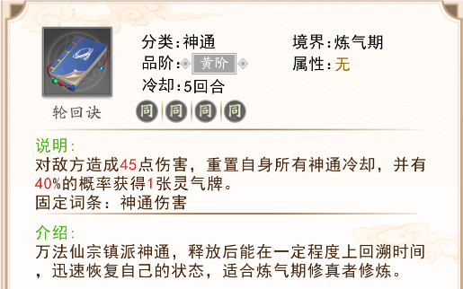 轮回诀:能够直接重置所有神通的冷却时间,但需要一次性花费4种灵气牌,所以当需要使用时,一定是有神通处于好几个回合的冷却时再使用。