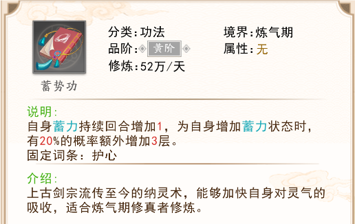 蓄势功:增加自身的蓄力回合,若已处在蓄力状态,则会有概率额外增加层数。