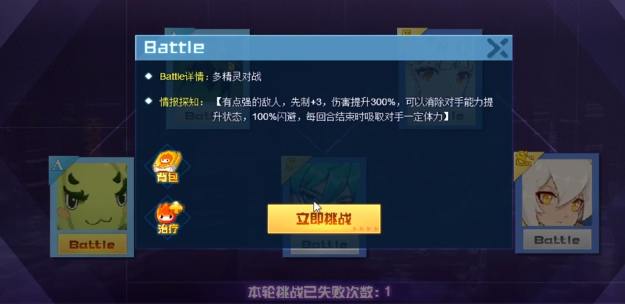 有些玩家这里翻车了两次,所以大家要注意,及时补点血药,所以还是建议用克制的精灵来慢慢磨血,至于第五只还是银翼吉光先打倒对手,强攻的话各位要根据自身实际情况量力而行,这第五只有60%的减伤效果,每回合还会清除我方2个技能的pp值,不过通过自爆与强攻的方式还是可行的,之后可以让1血高热冰冷塞勒涅单挑,最后圣普单挑,因为圣普要肉一点,这样才有可能顺利过关。