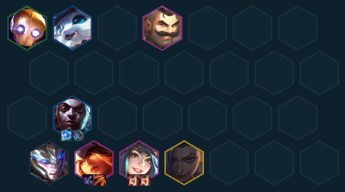 后期变阵4-5拉八,大搜找希维尔、布隆和刀妹三张四费卡,先保证4极客4强袭2保镖的基础阵容,再根据场上情况决定是否继续搜整体二星质量还是直接上九找金克丝,一般来说二星希维尔足够锁血上九。