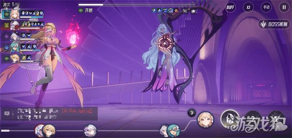 莎朗是我们爬塔中会遇到的难度boss,她总共有3个阶段,第1阶段我们通过酣梦的“睡眠花苞”,以及芙蕾雅的技能二来抵抗住持续伤害,同时去压莎朗的血线,等压到还有一丝血的时候,让凌罗开大附加免疫效果,然后下一位角色平a收掉进入2阶段;在2阶段花骨朵会随机选择两位角色来附加标记,当被标记者行动时,花骨朵若没有处于不可行动状态,会眩晕一位并立刻行动一次;
