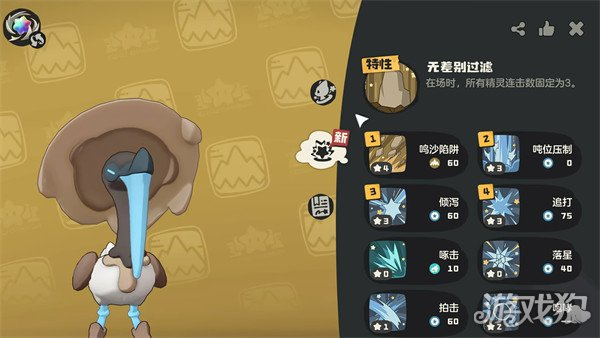 吸泥鸥通常不会被作为战斗宠使用,而是在它进化成为泥吼牙后,才会被人们编入精灵队伍作为克制连击精灵的奇兵。这是因为泥吼牙有着无差别过滤的特性,能强制将精灵的连击数固定为三,对需要打高连击来完成伤害输出的精灵有着非常不错的克制效果。而且它自身的物防也足够优秀,配合上鸣沙陷阱的攻击也能在战斗时对敌方造成较高的伤害,所以在合适的环境下能有着十分优秀的表现。此外,若各位只是想开图鉴,并不打算将泥吼牙放入阵中让它战斗,那么在升到40级完成觉醒后就可以不再投入任何资源养它。