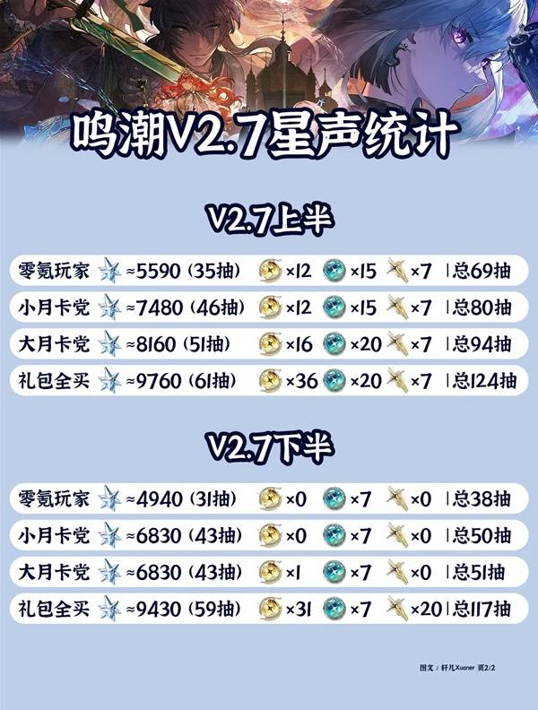 《鸣潮》2.7版本即将到来,为了帮助各位规划好自己的抽卡资源,下面请看由“轩儿Xuaner”为大家带来的《鸣潮》2.7版本抽数统计,希望可以帮助到大家。