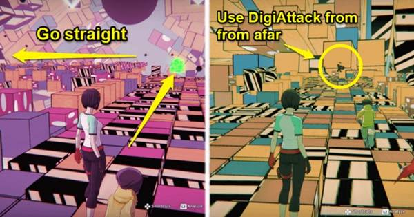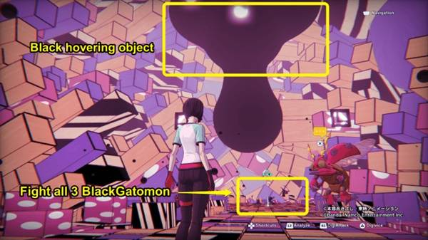 ③继续沿着这条路走。左转直走,你会看到第三辆 BlackGatomon 闲置。为了防止它传送离开,一旦你接近它,就开始按下 DigiAttack 的按钮,然后击败它。