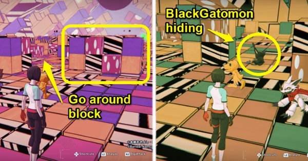 ②如果你沿着右边的小路走,你应该会在路上看到一个块状的障碍物。绕过障碍物,你会看到第二个 BlackGatomon 躲在它后面。攻击它以捕获它。
