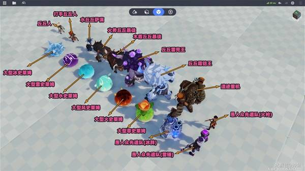 敌人包含:丘丘人+打手丘丘人+木盾/火斧丘丘暴徒+丘丘雷兜/霜铠王+水丘丘萨满+大型火/水/风/雷/草/冰史莱姆+愚人众先遣队(雷锤/火枪/冰胖)+遗迹重机。