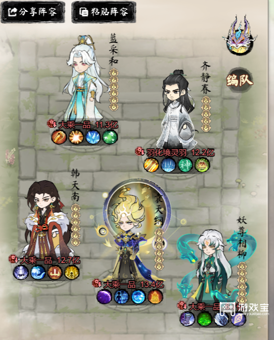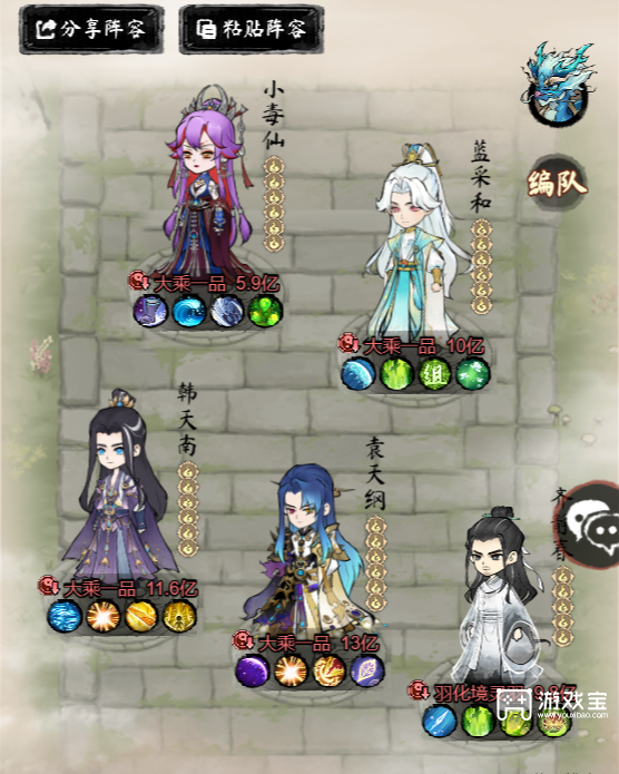 装备上,袁蓝韩穿鱼,毒仙穿鸟,平民也可以用这套,大五行换百花,主要靠小毒仙逍遥游打伤害配合袁抽血,同评分可以打相柳,一直在用
