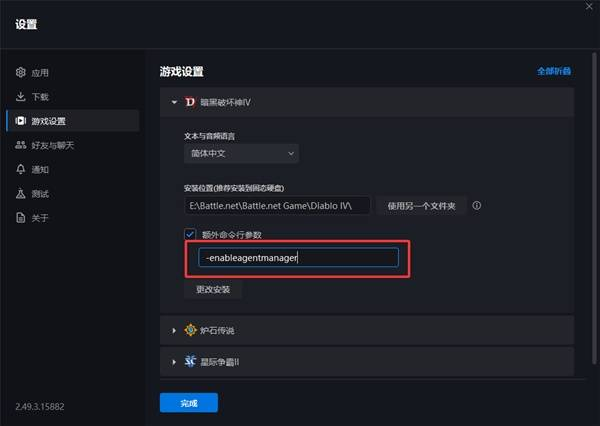 (4)在战网客户端——>游戏设置——>暗黑破坏神4——>勾选额外命令行参数,添加下列参数后点击完成按钮: -enableagentmanager(注意这个-前面要加一个空格)