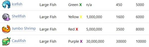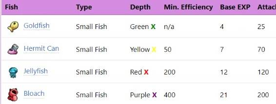 钓鱼与其他的采集类Skill有所不同,钓鱼的EFF不止影响获得的数量,还影响钓鱼的“深度”,不同的深度可以获取不同的鱼类。同时还有鱼竿,鱼饵,钓鱼所在的钓鱼区域会影响不同鱼类的上钩几率。在三十级之前可以在W2左侧的前两张图获取到四种不同的“小鱼”如下图所示。