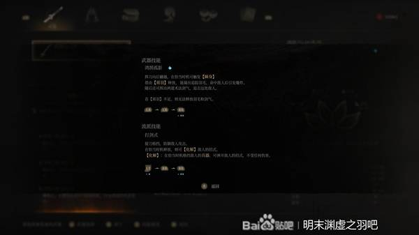 【1】鸿鹄刀 能力:其实就是 法术版的 赤虺刀,吃武器法术加成,所以淬羽武器法术加成的砭针。武器技能【鸿鹄孤影】分两段,都是远程攻击,按第一下LB打出 三枚追踪弹(耗1须羽),按第二下打出 两发剑气(耗2须羽,),然后接一下平A就是长刀最后一A回羽毛,很好用。