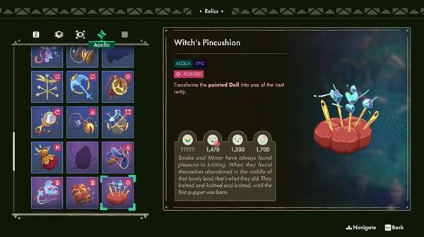 女巫针垫遗物具有"指向"效果,它能立即将一个娃娃转化为下一个稀有度。这为您省去了在转化过程中用一堆杂乱的遗物填满背包的麻烦。