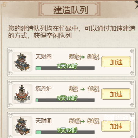 7、以上的四个建筑升级都是2天多,大家直接加速即可。
