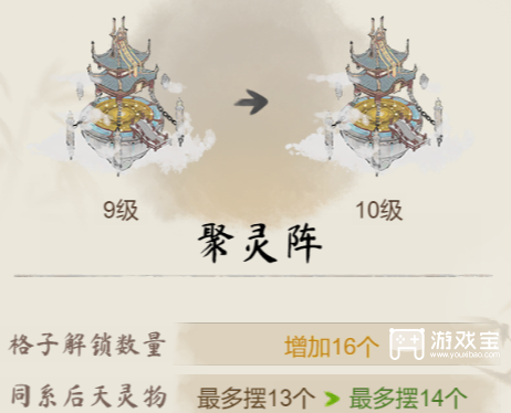 11、其次是聚灵阵,七曜塔开放1400层,灵物等级也提升到258品,数量提升至14个。