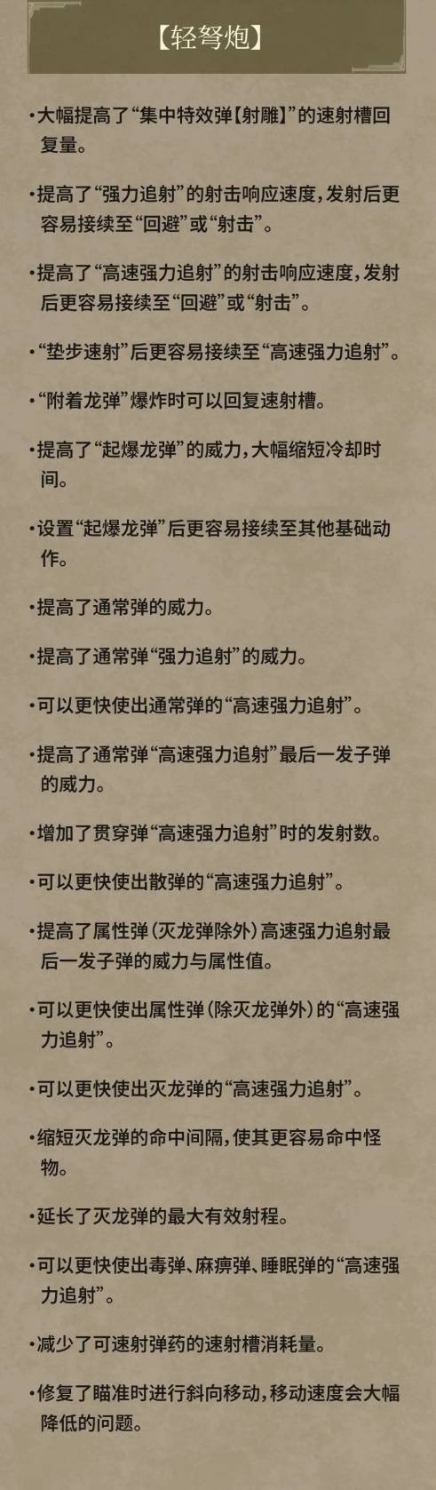 这点很好理解,追射是轻弩在荒野中的新机制,而如今仅有散弹会考虑使用速射状态下的追射(速追),导致此机制在目前版本中较为鸡肋,而本次加强从动作值到射速方面全部增强,当然具体实战中是否真的可以用,还是要看具体数值改动,暂时不太好评价。