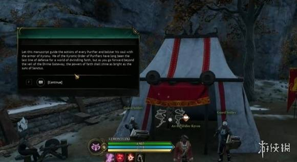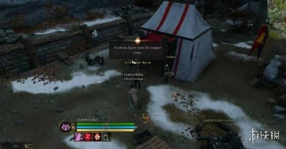 对话结束,找到如图所示的NPC并与之对话,他让我们进入后面的帐篷中对话。