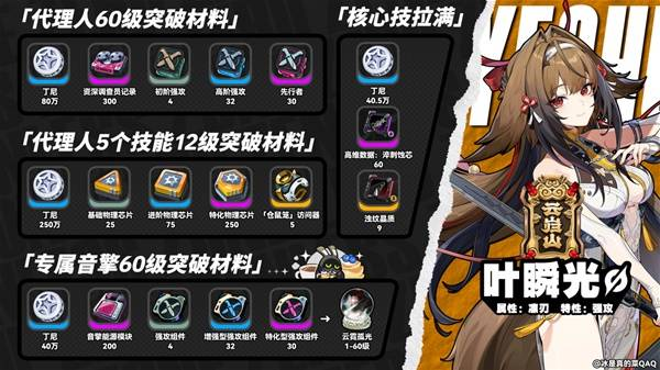 为了方便给大家制作了叶瞬光及专属音擎突破材料图,下图为叶瞬光60级、5个技能拉满12级、核心技拉满和专属音擎「云霓孤光」60级材料!