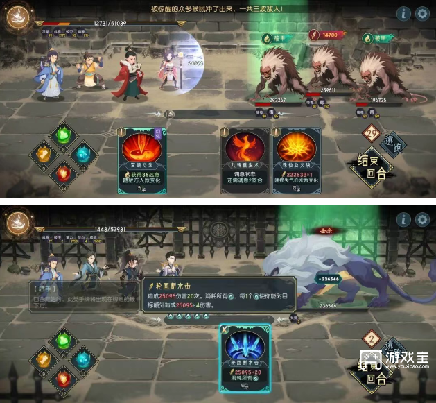 单次能打死的就上慕容月+法力天悟,需要两回合双怪的就凝符天悟+白洛