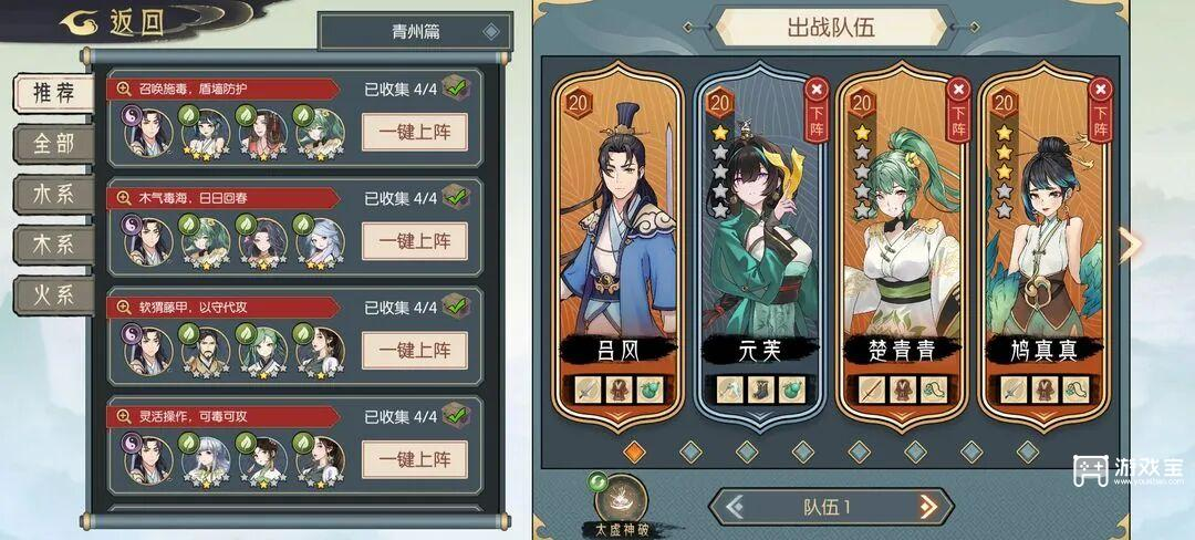2.毒队:主角+青青+真真(都双法力装备,词条随意)+元芙(凝符+血装)
