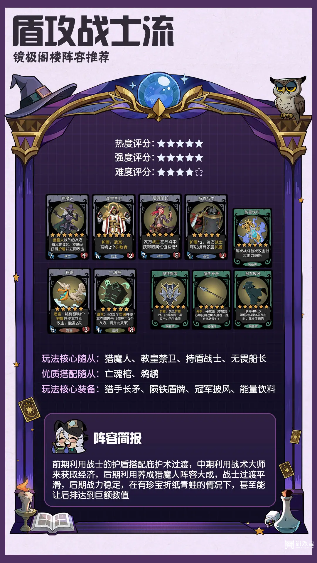 玩法思路:领主、筑甲师、玫瑰剑士等随从装备破盾加属性装备,盾弩装备旋风斧等增伤装备,达成联动效果。九头蛇在有多盾装备的情况下可以超额拔高阵容上限,老鼠作为必要启动器。