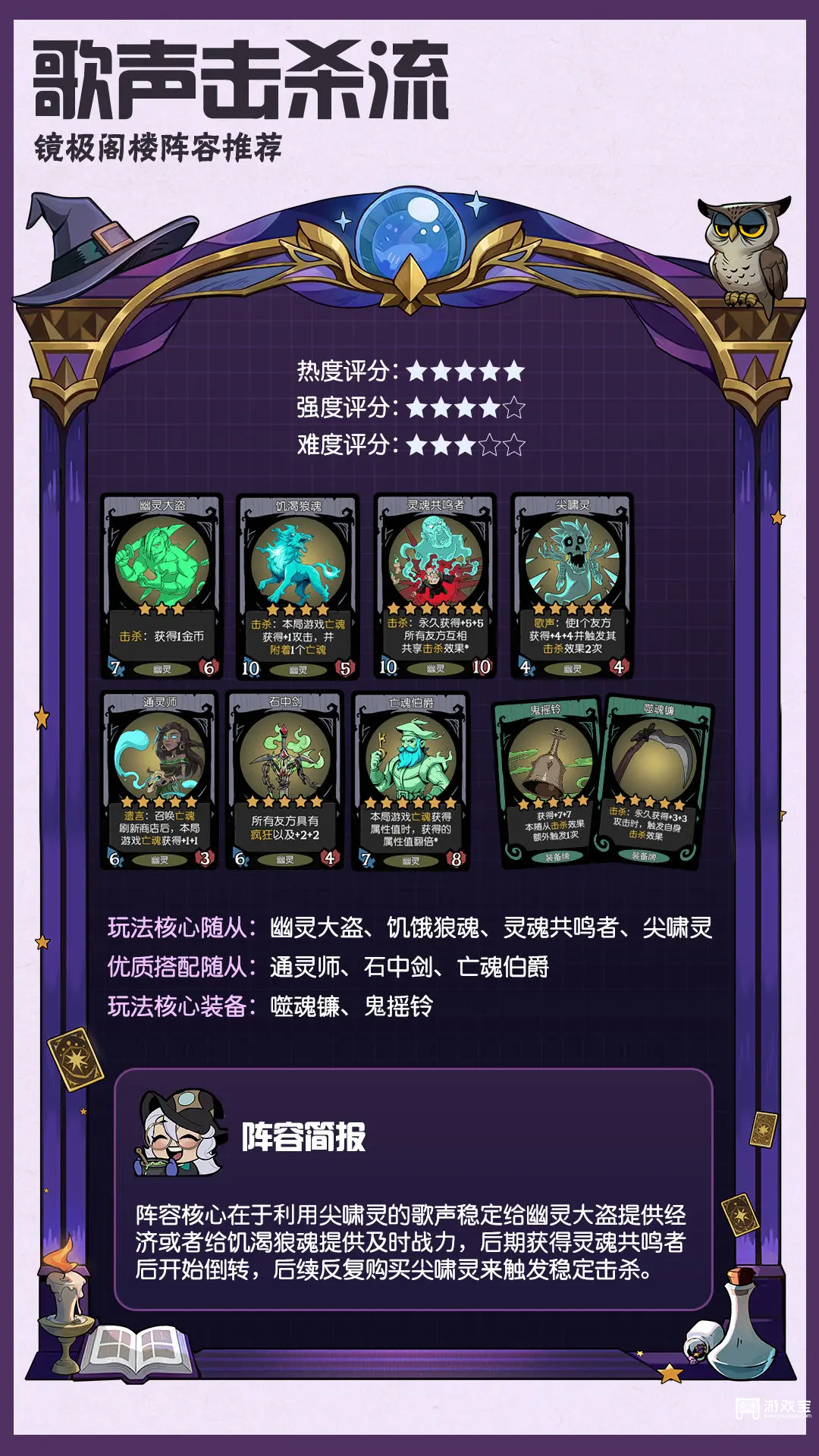 玩法思路:通过情圣、先王的怨念和魅影的搭配达到快速刷抉择牌的效果,重点发育古堡幽灵和亡魂的身材。该阵容以古堡幽灵作为主战力,亡魂流玩法为辅助战力。