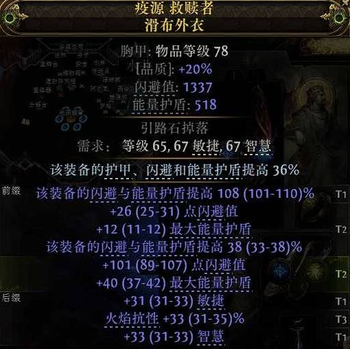胸甲:闪盾衣,首先选择闪避尽可能高的,然后后缀尽量从智慧、敏捷、火焰抗性、闪电抗性里面找,1200闪避以上尽可能多有用词缀的,没有也没关系,高抗性的鞋子以及手套价格都不高,胸甲我们尽可能补闪避护盾。