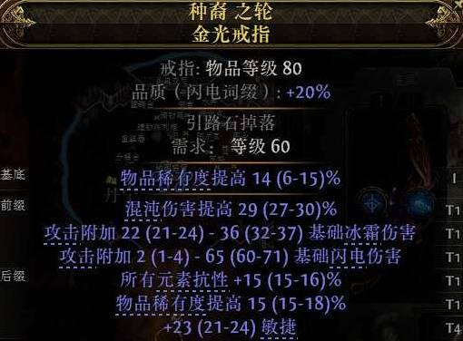 戒指1:明恩的慧心紫晶戒指,无需多言,满roll也是白菜价,大头在打催化剂,前期也可以不打,如果想提升就找额外混沌伤害瓦超上限的,还有就是瓦出伤害提高的,伤害提高这条附魔甚至可能比瓦超上限的收益会高,全局防御降低我们就通过追猎升华的属性点变为全局防御来补。
