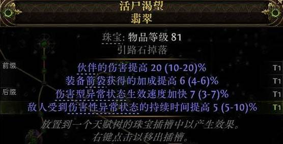 所以翡翠的后缀我们必选一条伤害型异常状态生效速度提高,然后在前缀找inc伤、中毒或元素异常强度,前缀优先找伙伴伤害提高以及箭袋加成,然后找所有的伤害提高词条以及中毒和异常状态强度词条。