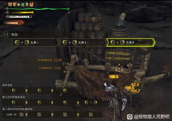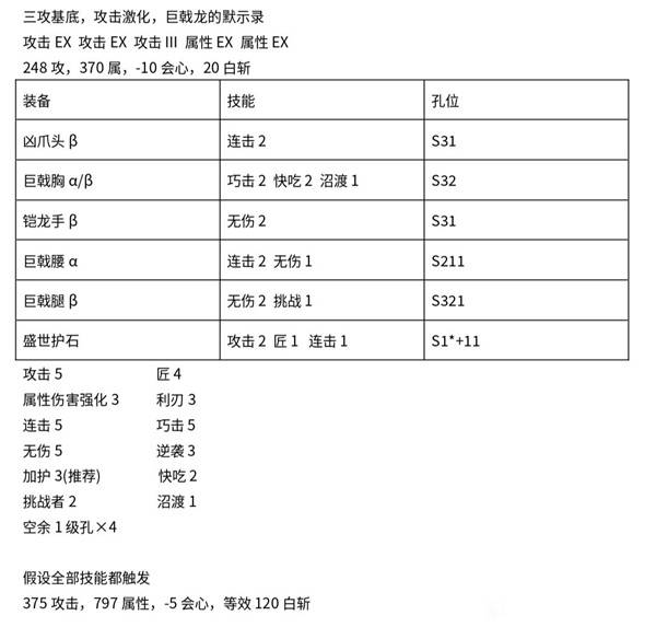 反正双刀的会心已经够烂了,不如让他一烂到底。目前没看到除开火外比这伤害更高的配装了。对伤害有疑问的看下面的图,表中最下面的伤害是无蓝鬼,无外置加攻(如猫饭,力量护符和鬼人药等),仅靠本身技能就可以到达的攻击力,实战开个蓝鬼就上400了。下面图的伤害是除逆袭以外技能全开,开蓝鬼,吃大猫饭和带力量护符得到的伤害(没吃药),开了逆袭伤害能上2400+。