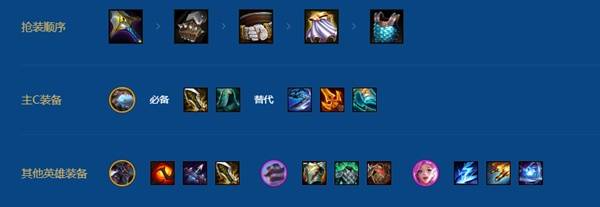 海克斯霸王龙必备无尽和水银,第三件可以是物理神器,或者锐利、巨杀、链枷也可以用。千万不要带非物理输出装备,例如汲取剑等。主T在布隆2星前可以是洛里斯,必备石像鬼石板甲和振奋盔甲,第三件可以圣盾使的誓约,如果后排卢锡安做不出来功能装也可以上日炎或者薄雾。卢锡安带启动+功能装。