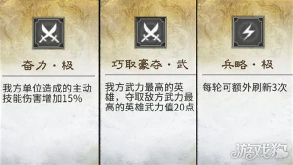 初始效果建议锁定以下三项:提升主动技能伤害15%的“奋力·极”、可夺取敌方高武力武将20点武力值以增强容错的“豪夺·武”,以及每轮额外增加3次刷新权限的“兵略·极”。三者协同作用显著,兼顾输出强化、生存保障与策略弹性。