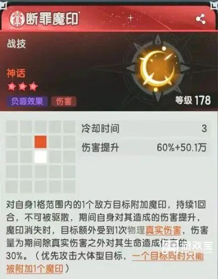 3回合冷却,纯单体,第3回合和第7回合发动,第4回合和第8回合出伤害,不能与其他斗士魔印叠加。红魔印提供单回合全技能60%+30%=90%增伤,并且30%那部分是真实伤害,单体最强技能之一,在纯单boss无杂兵环境基本必带,其他环境不带。
