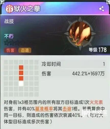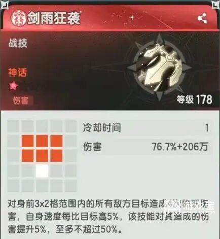 1回合冷却,群体技能,本身数值很一般,但跟烈火之踵有很强的配合,所以必须瞬影剑舞+烈火之踵组合使用,纯单体测试下来不如4转流刃火舞和5转破碎连舞。2只以上怪物则必带,纯单体不带。