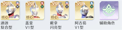 流派特点: 迪迦复合型和阿古茹V1提升队友控制命中率,盖亚V1和戴拿闪亮型频繁施加控制效果。