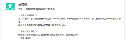 另外米里昂的被动效果当中还有反向线的技能,这个技能就可以根据她当前的站位来获取多重能力,如果在前排站位,她在战斗一开始的时候自身会获取更多攻击力,上面有180%的护盾防御,然后受到了10次攻击的话,累积起来就会获取攻击力上面40%的额外防护,减少自身3m内敌人的物理以及魔法类型的抵抗效果,如果米里昂是在后排的话,得到了一个特化能力是体现在猛攻效果上面,也就是说米里昂受到的这种伤害后,在增加了10%数值之后,自己造成伤害时候固定会增加30%的数值,而且在自己释放技能的速度上面同样也增加30%。
