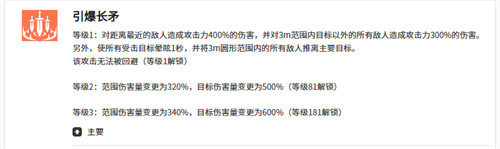 这里利用米里昂的主要技能可以带来引爆长矛的能力,此时进行攻击会对距离米里昂比较近的敌人造成400%的攻击,这个数值还是不错的,另外还可以对3m范围之内除了主要输出目标以外所有的敌人,再一次造成攻击力300%的伤害,虽然这一次的伤害不是达到了很高的数值,但是毕竟第二次输出的连招里面,是一个群伤效果,而受到所有伤害的敌人身上都会达到1秒的眩晕,并且在此时将3m范围内的敌人都推离他攻击的主要目标,这个攻击没有被对面回避的时候,其实大家就可以快速的将敌方的输出角色孤立出来,这样的话选中一个主要目标进行输出,后期就可以很快的带来集火的能力。