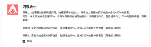 米里昂终极的大招效果上面可以带来的是闪现反击,此时攻击敌人带来的连续斩击能力当中会造成400%的攻击,而且目前这个攻击能力是针对敌方输出最高的敌人进行的,而且此时给自己带来的数量加成,是在当前关卡当中永久增加30%数值的,所以后期米里昂只要使用辅助技能的话,就会消耗掉500魔力,但是此时造成的攻击力、生命额外伤害会达到100%的数值。最后的支援技能带来的是超频加速,米里昂使用这个技能是只能针对后排的友军带来足够的增益能力,此时的增益体现在伤害跟速度加成效果上面都是带来25%的提升时,米里昂可以给队友带来的各方面能力还是有比较强势的数值可以看到的。