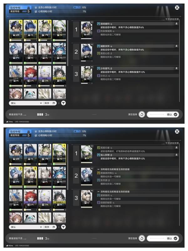 中枢最好是两队轮换保证干员回复心情速度,下面是推荐组合,优先拉上面一套(均为精3开满级中枢技能,花费较少)。