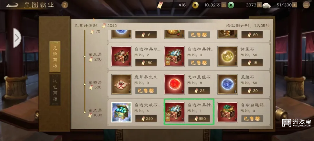 2、皇图霸业是零氪玩家获取稀有神兵的核心渠道,通过参与皇图霸业玩法可稳定产出稀有神兵,攒齐3把稀有神兵后,即可前往神兵商店兑换1把无双神兵,这是最具性价比的免费获取方式,建议优先参与皇图霸业的核心玩法,稳步积累神兵资源。