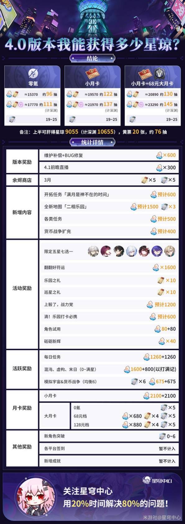 《崩坏星穹铁道》4.0版本将带来全新的地图与剧情,那么新版本中有多少抽可以获得呢,下面请看“星穹中心”带来的《崩坏星穹铁道》4.0星琼数量统计,希望能够帮助大家。
