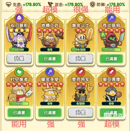 ②黄金斗士——获取简单,数值也够,技能能回血,能抗能打,仅次于鸡哥,可以理解成小ikun。PS:航海遇到同战力的黄金斗士人机就知道什么叫数值了,另外图鉴里没满星是因为我部分金卡自选开了鸡哥。