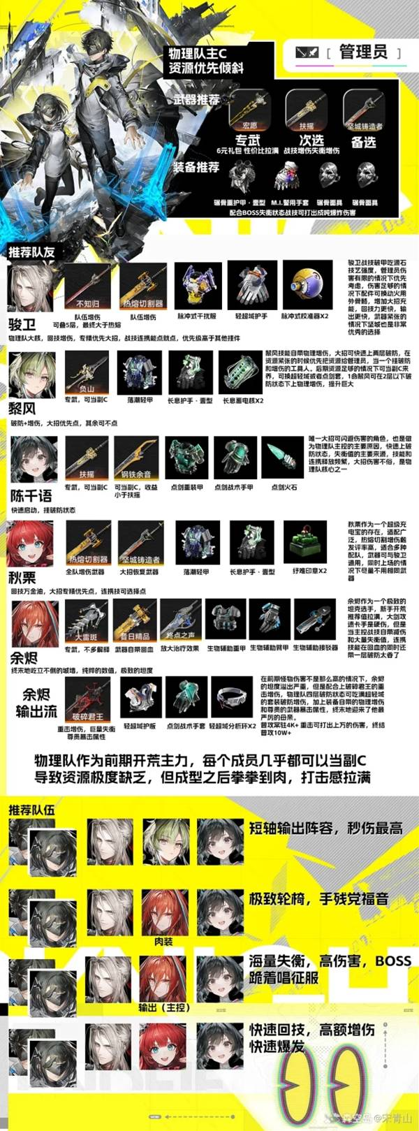 《明日方舟终末地》物理队是当前版本中有着不错伤害的配队,那么物理队具体要怎么养成呢?下面请看由“宋青山”为大家带来的《明日方舟终末地》物理队养成及配装攻略,希望可以帮助到大家。