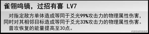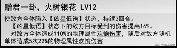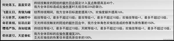 ·核心:我方攻击目标都会触发一次「欢愉伤害」,且该次攻击如果是消耗战技点的攻击即可触发两次「欢愉伤害」;(不是追加攻击)